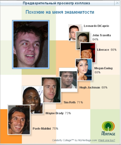 | Сайтик хороший моно узнать на кого ты похож из знаменитостей http://www.myheritage.com/FP/Company/tryFaceRecognition.php